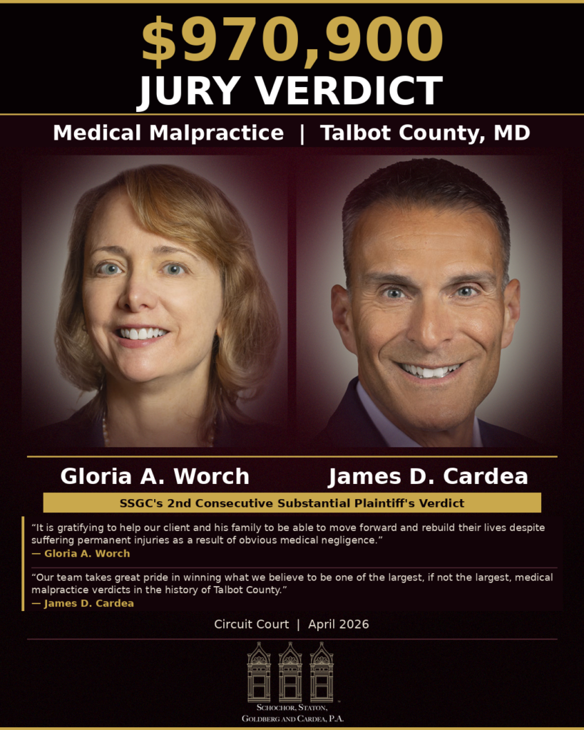 When you’re fighting against corporations of massive size and reach, you need a firm that has the experience, resources, and connections to take them on. You need Schochor, Staton, Goldberg and Cardea, P.A. Whether you’re looking for Baltimore medical malpractice lawyers or class action attorneys, we have the deep experience to win in real, impactful ways. We’ve litigated against some of the most well-known industry giants — and we won. Let us show you why.